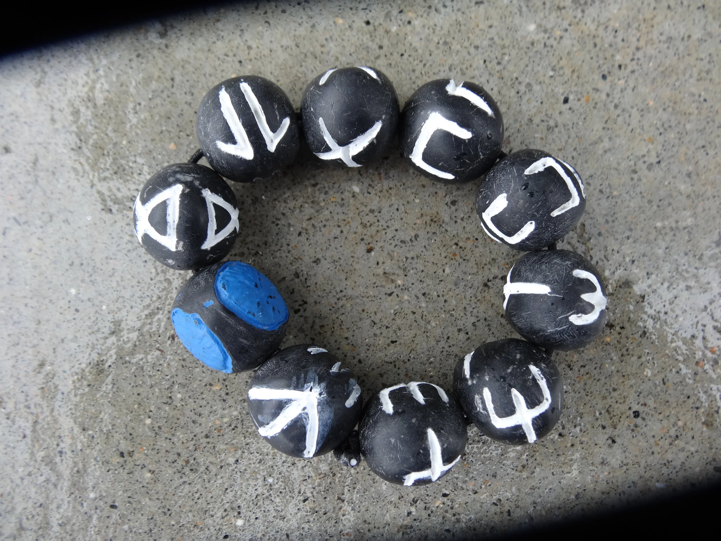 I made a bracelet of kimoyo beads out of Sculpey, and as I couldn’t find a description of the symbols on Shuri’s bracelet, I spelled out my daughter’s name in Wakandan instead.