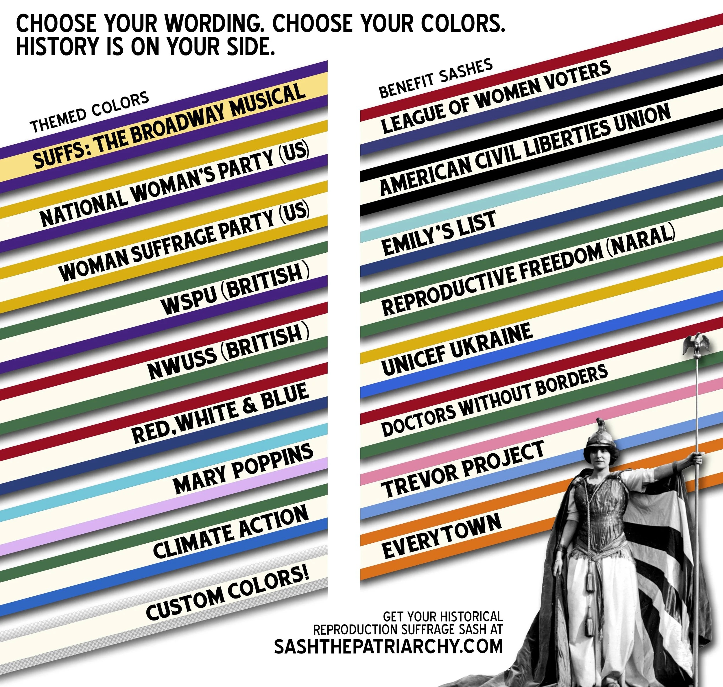 I’ve made some non-historical themed sashes, such as reproductions of the sashes I made for the Broadway musical Suffs; or those that match the suffragette sashes seen in Mary Poppins; or those for the Costumers for Climate Action movement (blue, white and green); or the classic red, white and blue; or other combinations.